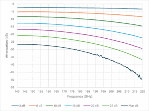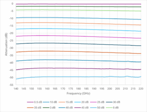 Figure 2a: Flann’s programmable linear vane attenuator measured attenuation performance in WG30 (WR5) showing near RVA levels of performance.
