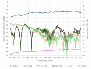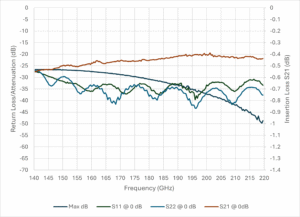 Figure 2b: Flann’s programmable linear vane attenuator measured performance for return loss, insertion loss, and maximum attenuation in WG30 (WR5), showing an improvement in all metrics when compared to the traditional linear vane attenuator.