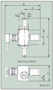 | Model Series 620 or 621 | Frequency Range (GHz) | Waveguide | VSWR (better than) | Max Insertion Loss (dB) | Max Power (Watts) |